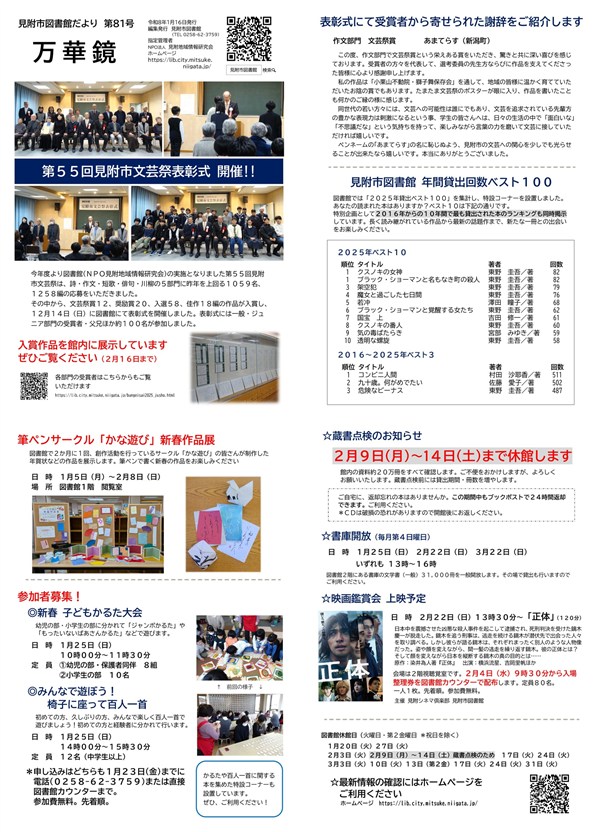 図書館だより「万華鏡第78号 2025年3月号」を発行しました。