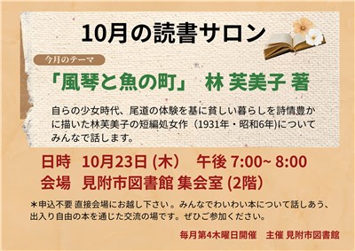 読書サロン(10月) 参加者募集! 10月は、「風琴と魚の町」林 芙美子著 自らの少女時代の尾道の体験を基に、貧しい暮らしを詩情豊かに描いた林芙美子の短編処女作(1931年・昭和6年)についてみんなで話します。 日時 10月23日(木) 午後7時00分~8時会場 見附市図書館 2階集会室 申込み不要(直接会場にお越しください) ※テキストはカウンターまで