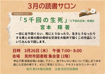 読書サロン(3月) 参加者募集! 3 月のテーマは、「5千回の生死」 宮本輝 著 一日に五千回ぐらい、死にとうなったり、生きとうなったりする男との束の間の奇妙な交流を大阪弁で描くこの作品についてみんなで話します。 日時 3月26日(木) 午後7時00分~8時会場 見附市図書館 2階集会室 申込み不要(直接会場にお越しください)